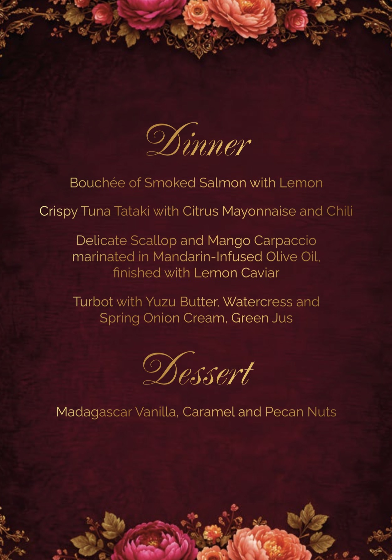 Every detail of this night — from the exquisite table settings to the melodies filling the air — will speak the language of beauty, admiration, and love.